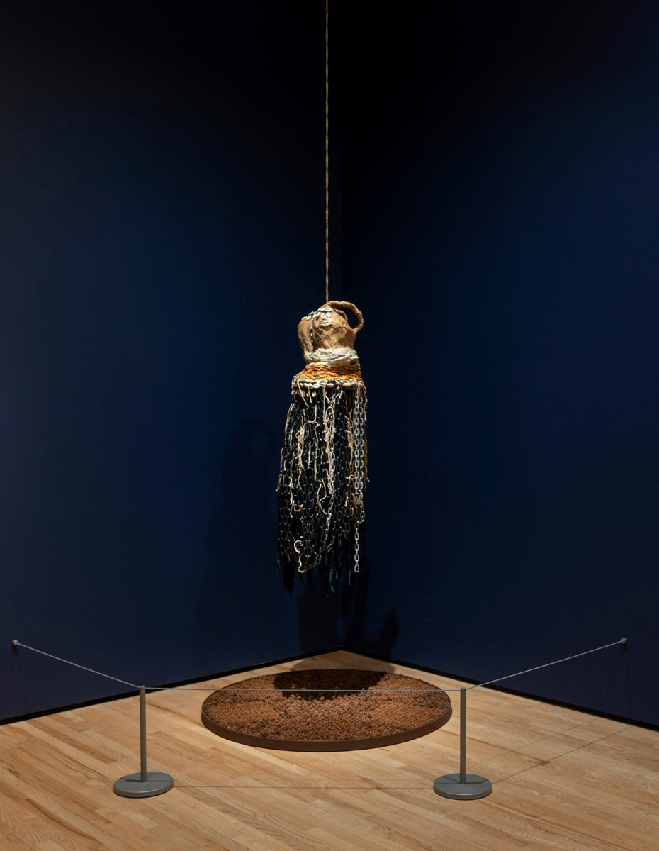 A sculptural dress adorned with cowrie shells along the neckline and center, and a skirt composed of long, hanging strands of black chains interspersed with natural fibers, creating a fringe-like effect.